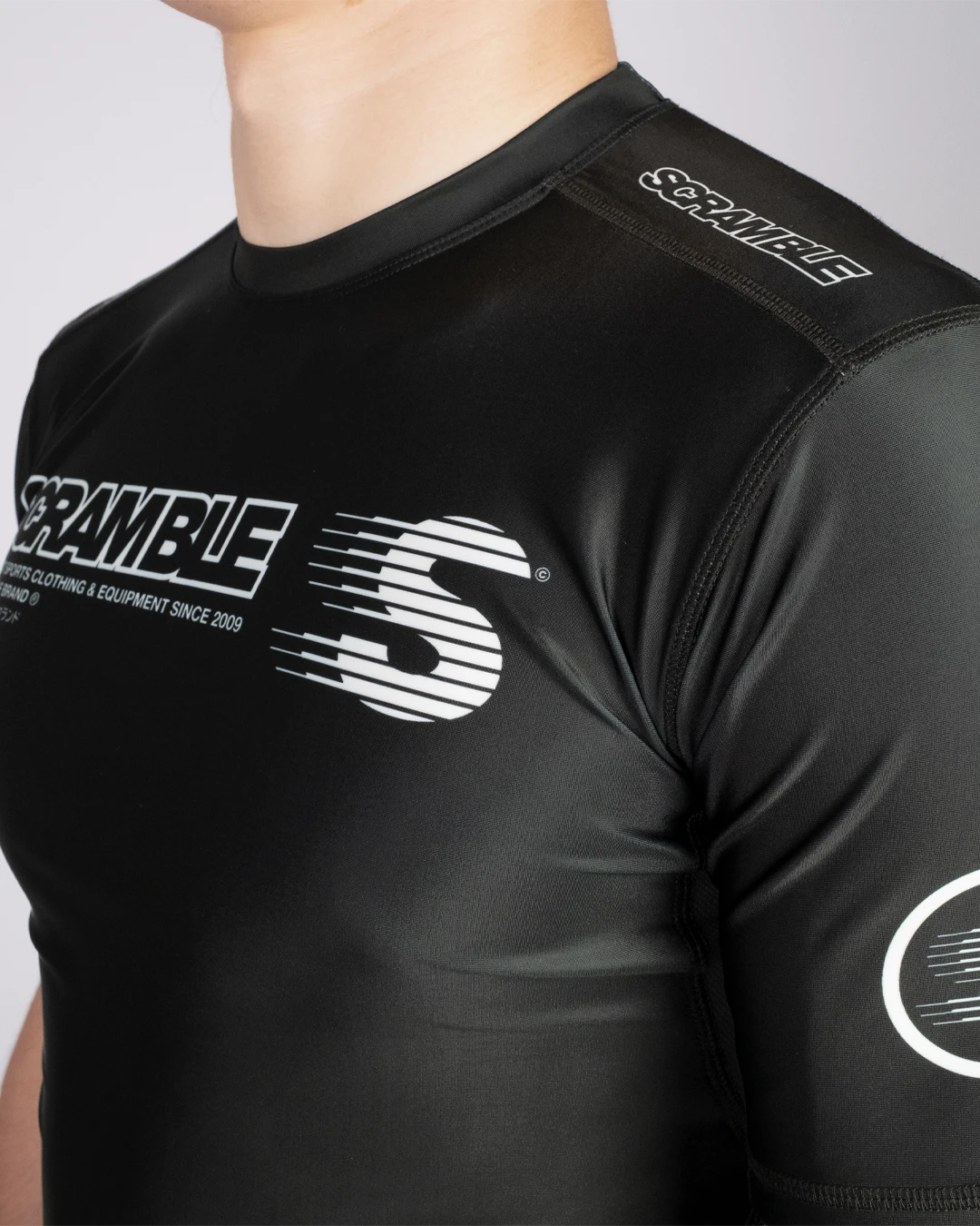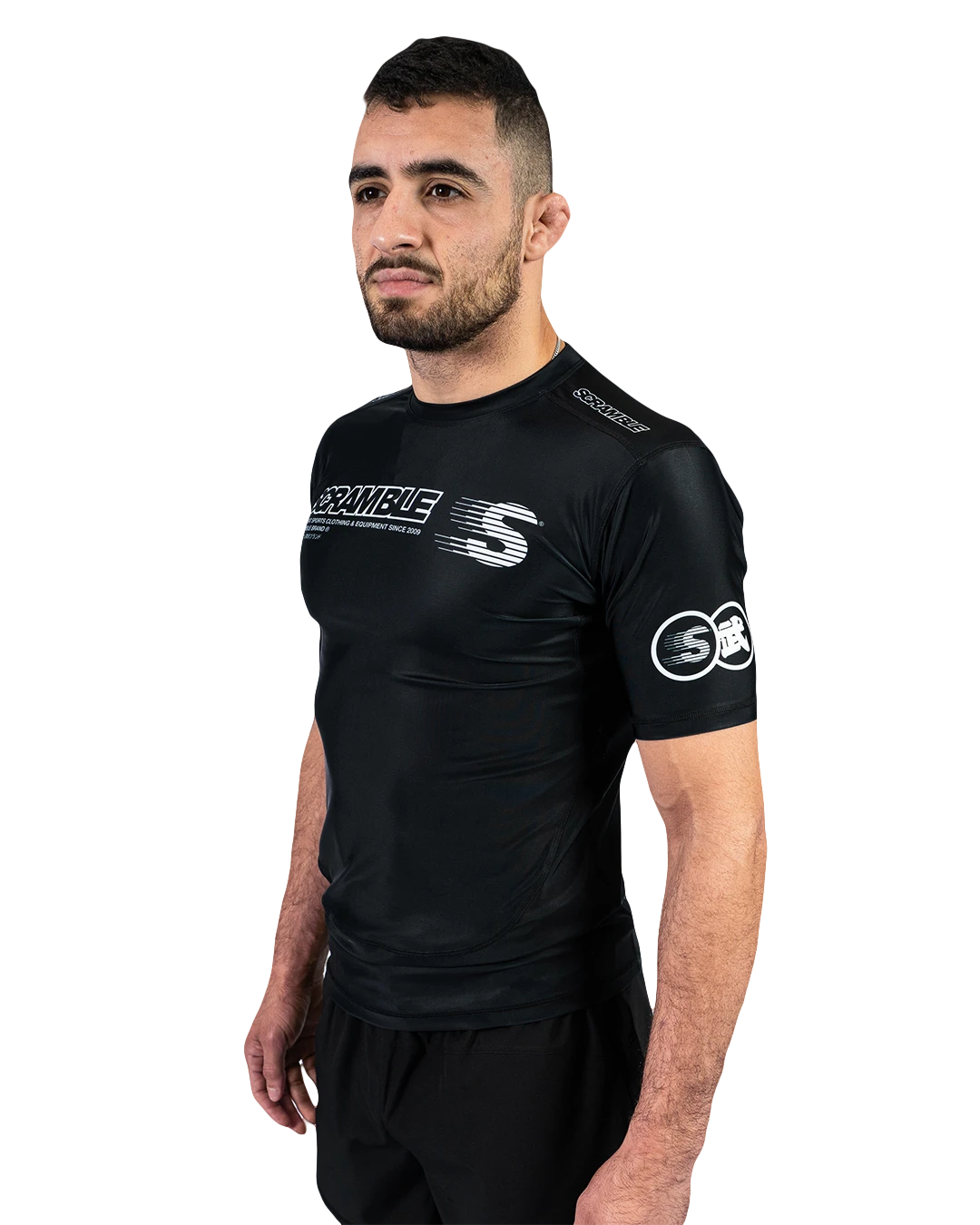 Our much-loved Tactic fit is back, which has multiple panels and materials combined to provide a comfortable and cooling experience for training jiujitsu. The Mirai set features a rashguard that uses the Tactic fit familiar to many of our customers, and new and updated Combination Shorts, both in a clean and understated black and white colour. Ideal for training BJJ, grappling, MMA and fitness, ‘mirai’ means Future in Japanese, and the Scramble logotype has been reimagined to look towards the future.
